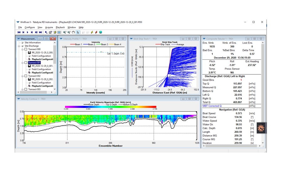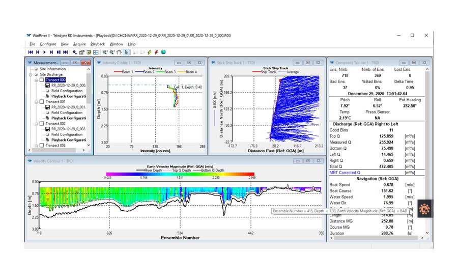 Dann wurde APACHE 4 mit dem D230 Einstrahl-Echolot und dem RiverPro ADCP ausgestattet, um automatisch entlang der geplanten Flussquerschnittslinie zu navigieren, und die Software zeichnete die Querschnittsdaten des Strömungsprofils auf.